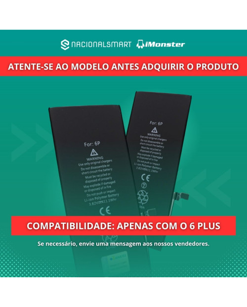 Bateria Imonster Original compatível com iPhone 6 PLUS Nova, homologada pela Anatel. Nossas baterias possuem saúde 100%, assim você terá a segurança e garantia de comprar uma bateria com excelente durabilidade. A baterias iMonster acompanham fita para fixação.